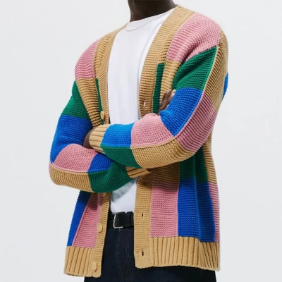 Single Breasted V Neck Knit Jacket Autumn Winter Mens Fashion Color Block Sweaters