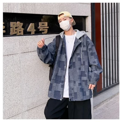 Retro denim hooded jacket men new contrast plaid casual cotton blue black