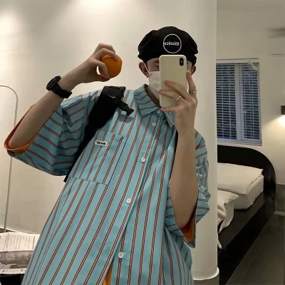 Striped short-sleeved men 3-color M-2XL Kong style loose design one-inch summer jacket